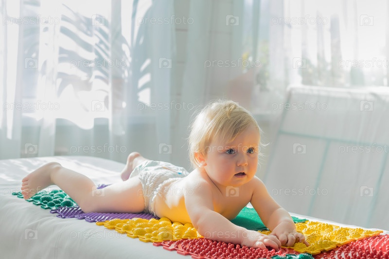 Малыш лежит на массажных ковриках животом вниз