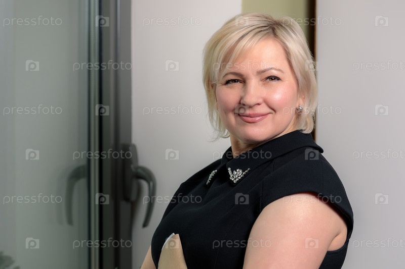 Женщина-директор, работающая в офисе, стоит у стола с папкой с документами