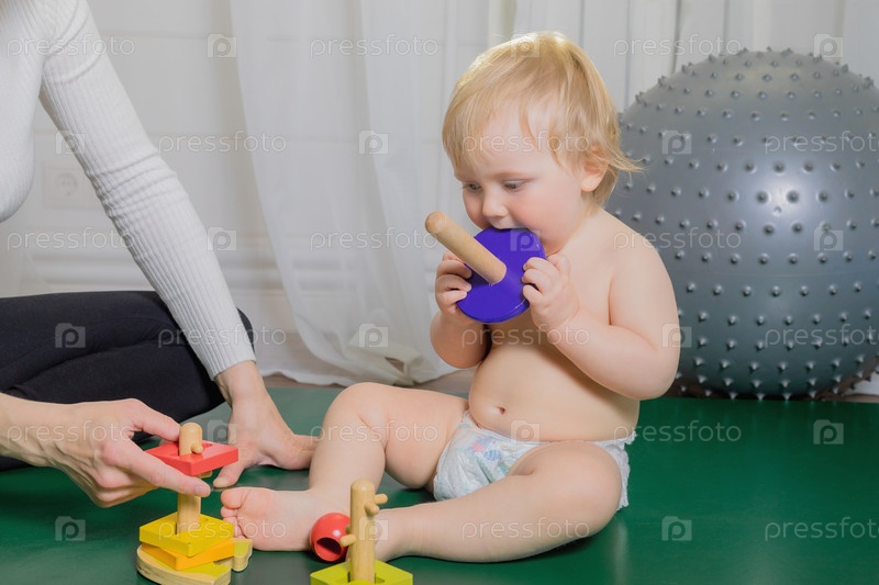 Малыш сидит на коврике, играет с мамой, собирает пирамидку