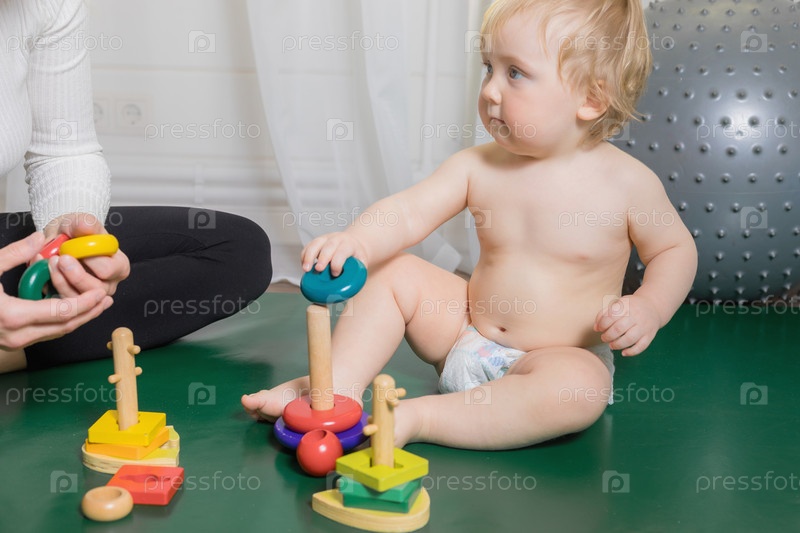 Малыш сидит на коврике, играет с мамой, собирает пирамидку