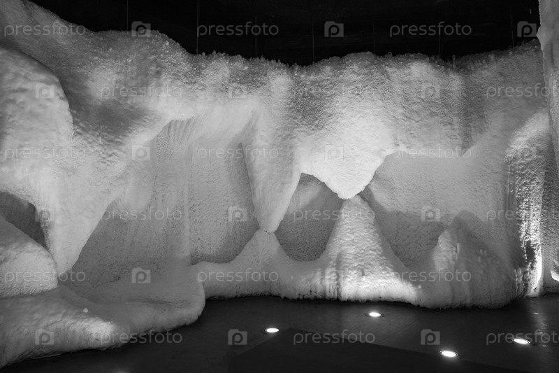 Сказочная искусственная ледяная пещера, стены которой покрыты снегом и освещены
