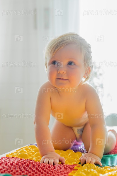 Малыш ходит босиком по разноцветным массажным коврикам
