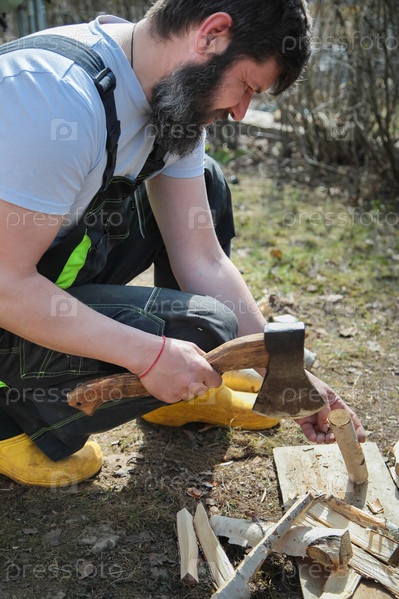 Бородатый мужчина в комбинезоне рубит дрова для костра. Березовые ветки