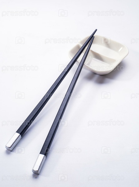 Черные деревянные палочки для суши с блюдцем для соуса. Вид сверху