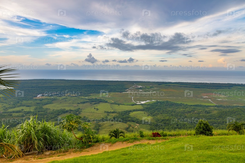 Вид с большой горы на долину с озером в Доминиканской Республике