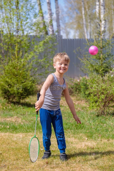 Светловолосый ребенок играет в бадбинтон на лужайке