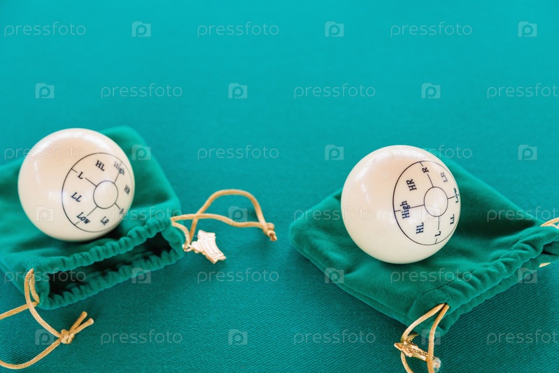Маркированные бильярдные шары с зелеными упаковочными пакетами