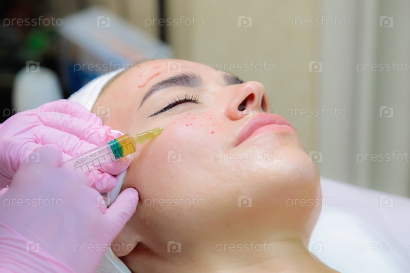 Врач делает инъекции плазмы крови в лицо молодой девушки