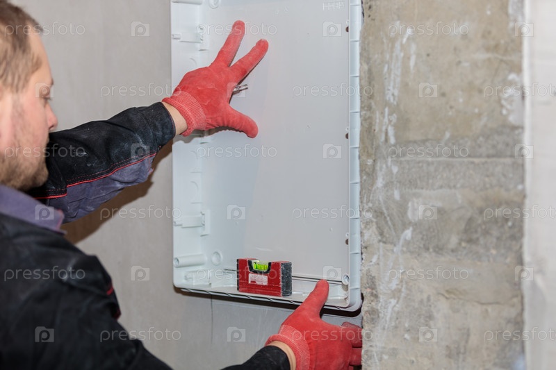 Электрик примеряет и отмечает линии электрощита