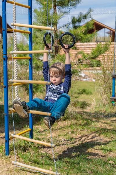 Светловолосый ребенок играет на детской площадке, висит на кольцах
