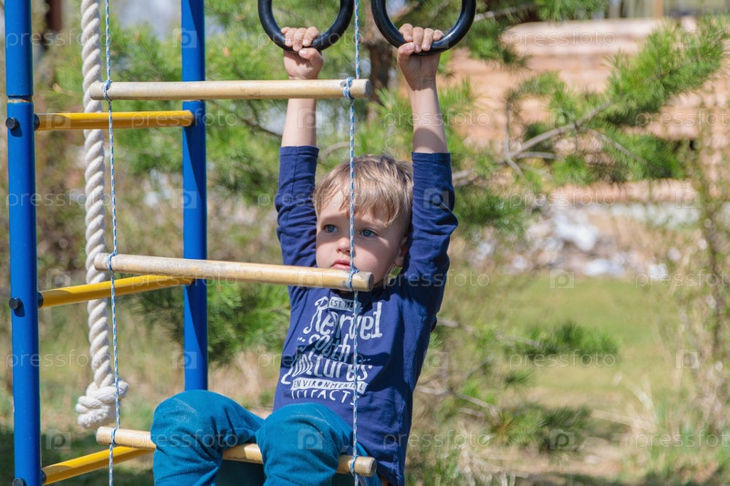 Светловолосый ребенок играет на детской площадке, висит на кольцах