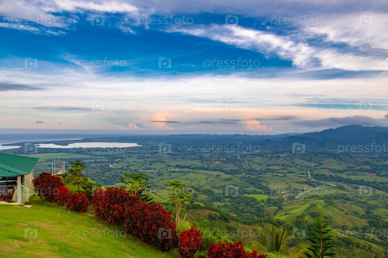Вид с большой горы на долину с озером в Доминиканской Республике