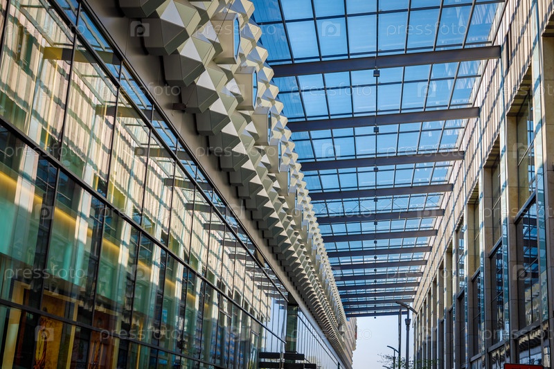 Стеклянная крыша с геометрическими металлическими перегородками. Ряды под крышей