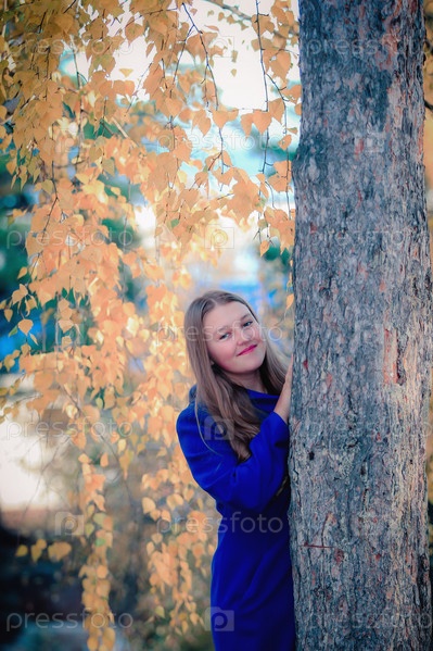 Молодая девушка гуляет в осеннем парке, стоит за деревом