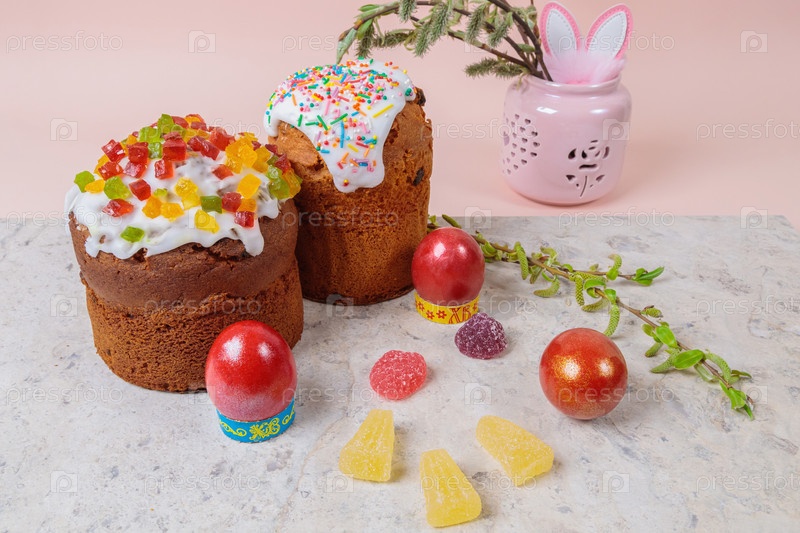 Пасхальный. Куличи с яйцами и кроличьи уши на розовом фоне. Пасхальный