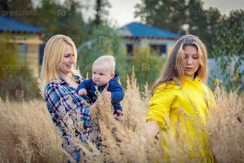 Молодая мать гуляет со своими детьми в поле с высокой травой