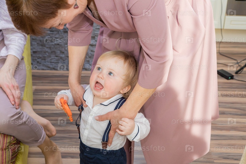 Бабушка играет с малышом, бегает с ним по дому
