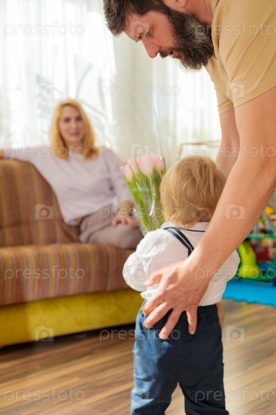 Папа с малышом, сын поздравляют маму с праздником