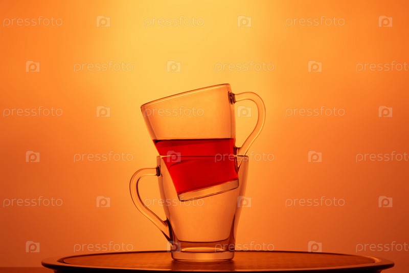 Стеклянные кружки с чаем, одна внутри другой, натюрморт на оранжевом фоне
