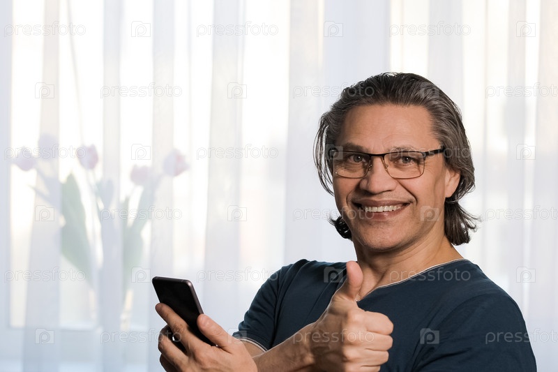 Взрослый мужчина надевает очки для зрения. Радость на лице