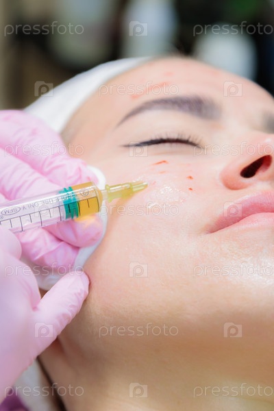 Врач делает инъекции плазмы крови в лицо молодой девушки