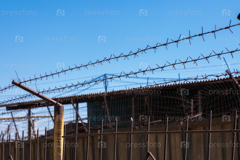Стальная колючая проволока на заборе в тюрьме. Крупный план