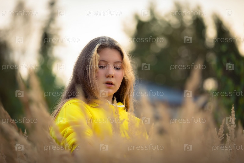 Молодая девушка с длинными волосами идет по полю с высокой травой. Светлые волосы