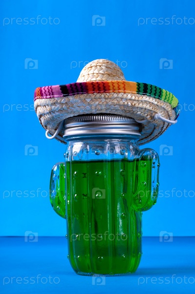 Зеленый напиток в стеклянной банке в форме кактуса с шляпой сомбреро на синем фоне. Холодный летний напиток. Мексиканский отпуск