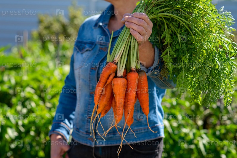Женская рука держит кучу моркови. Доставка свежесобранных овощей прямо с грядки к вашему столу
