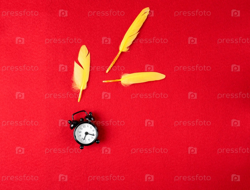 Будильник и желтые перья на красном фоне. Концепция утра, пробуждения, спокойного ночного сна. Плоская планировка с копией пространства