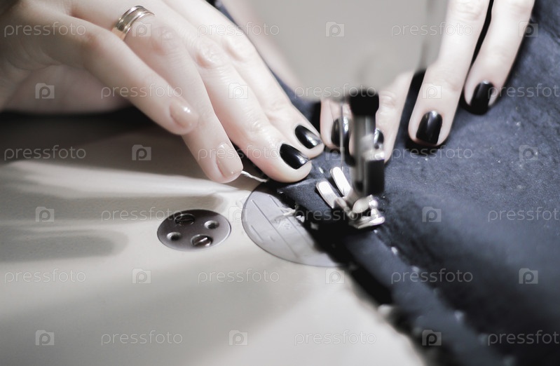Процесс шитья на швейной машинке, выполнение шва. Руки с красивым маникюром придерживают ткань во время обработки одежды