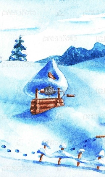 Колодец, зима, акварель