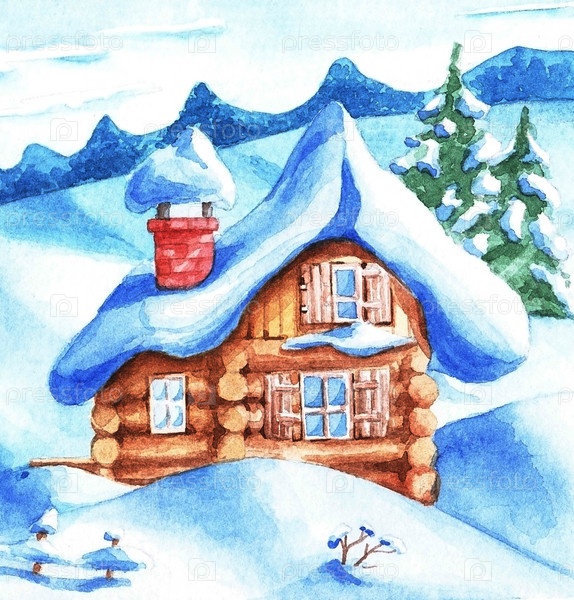 Зимний пейзаж, деревенский дом, акварель