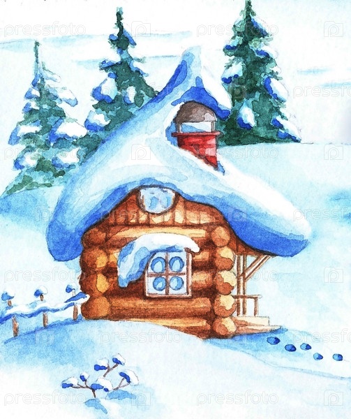Зимний пейзаж, деревенский дом, акварель