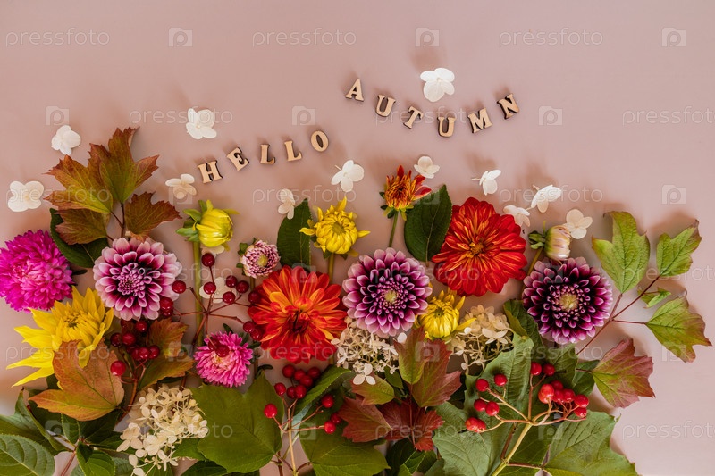 Букет ярких осенних цветов. праздничный бордюр. срезать георгины, астры, веточки калины. вид сверху. Текст деревянных букв-привет осень