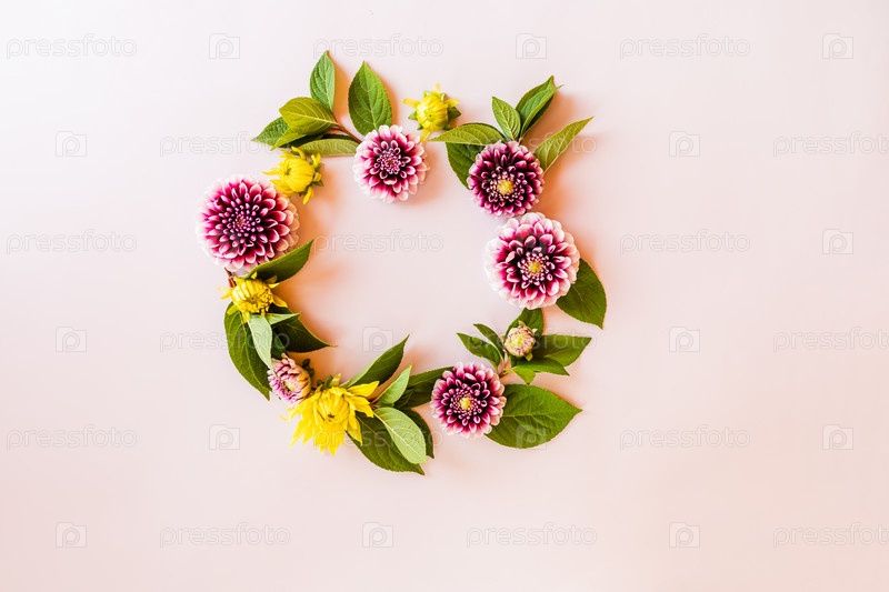 Круглая рамка из осенних цветов на белом фоне. яркие георгины и зеленые листья. осенняя цветочная концепция. цветочный венок