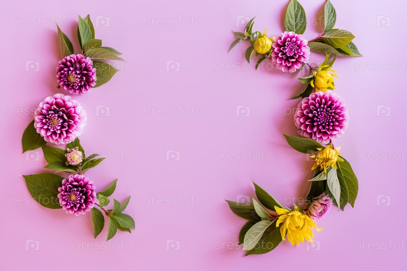 Яркая красивая композиция из осенних цветов. вырезать георгины и зеленые листья гортензии. цветочная рамка. место для текста. сиреневый фон. вид сверху