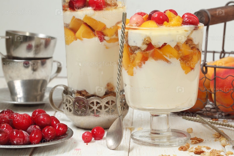 Десерт с рикоттой,персиком и клюквой на белом фоне