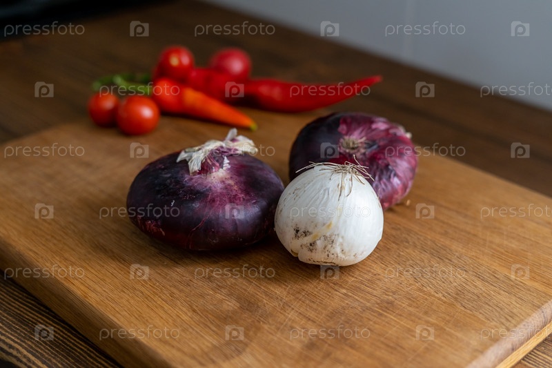 Красный и белый лук на деревянной разделочной доске