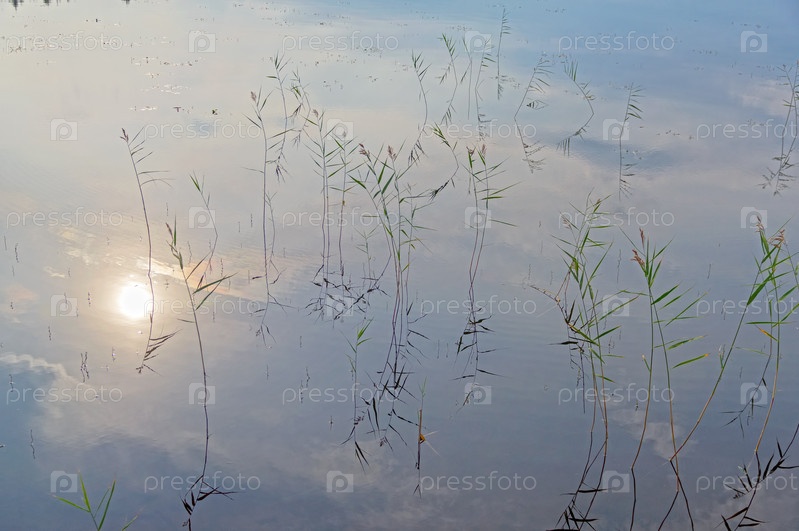 Отражение неба в водной поверхности в редких зарослях тростника. Река Писта, северная Карелия, август