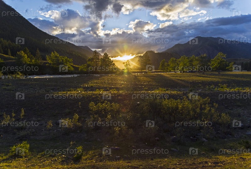 Закат солнца в горах. Берег реки Чуя, окрестности поселка Чибит. Горный Алтай. Август