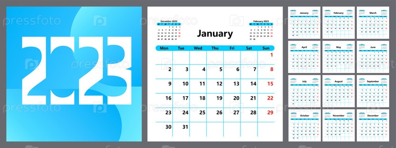 Календарь-планировщик на 2023 год. Неделя начинается в понедельник. Вектор