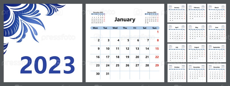 Календарь-планер на 2023 год с красивой обложкой, базовый шаблон. Неделя начинается в понедельник. Вектор