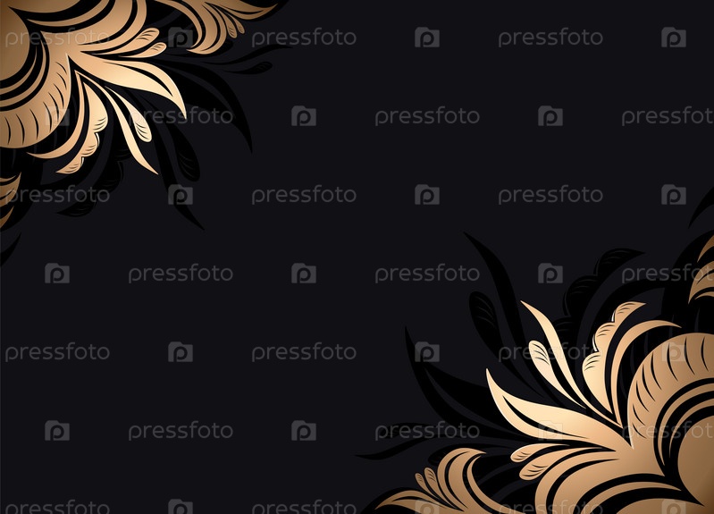 Черный фон с элегантными стилизованными золотыми цветами в углах, шаблон для обложек, открыток, поздравлений, приглашений на мероприятия, рекламы в моде, косметологии, флористике. Вектор