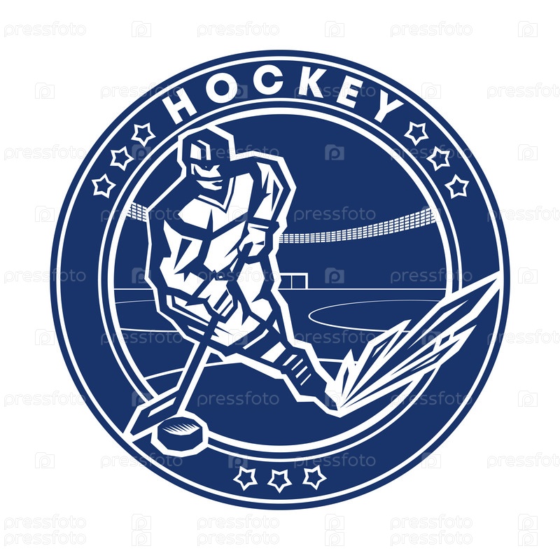 Хоккеист в движении, с шайбой и клюшкой на хоккейной арене. Круглая монохромная эмблема. Вектор
