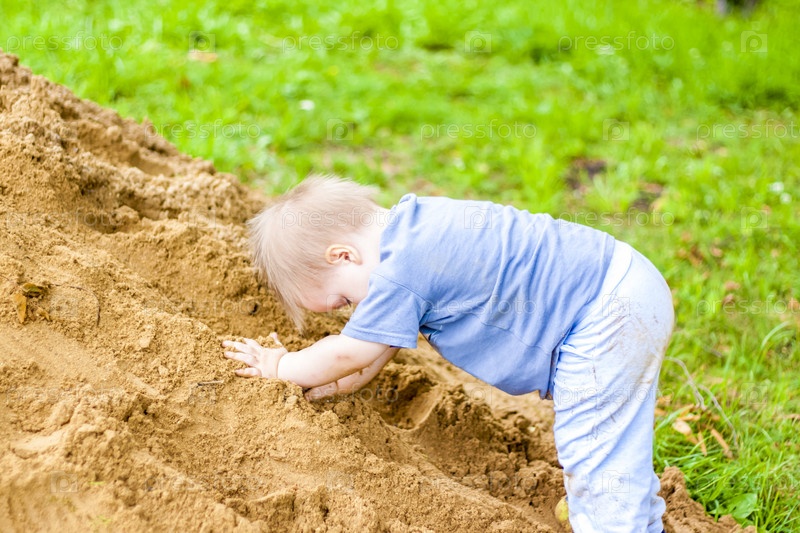 Маленький мальчик взбирается на гору с песком. Ребенок весь грязный, но довольный