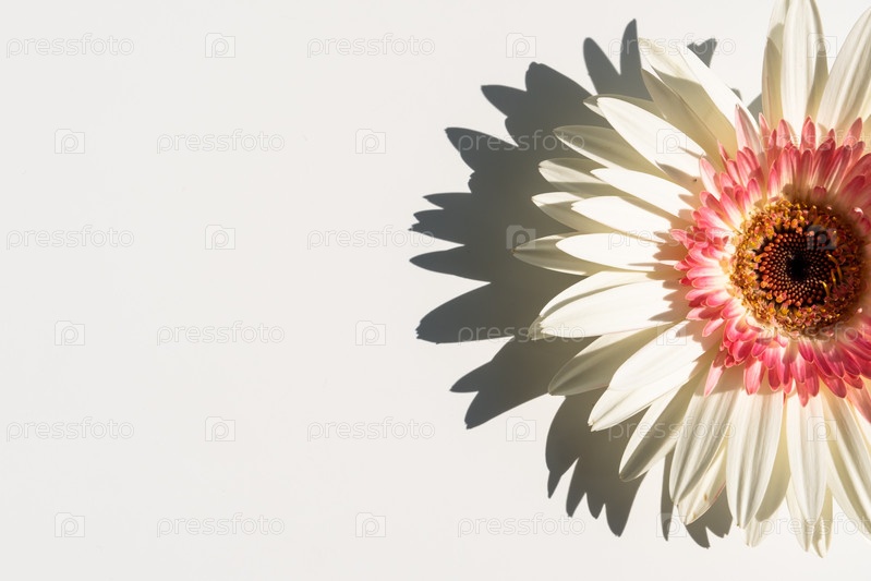 Белая гербера на белом фоне, плоская планировка, вид сверху