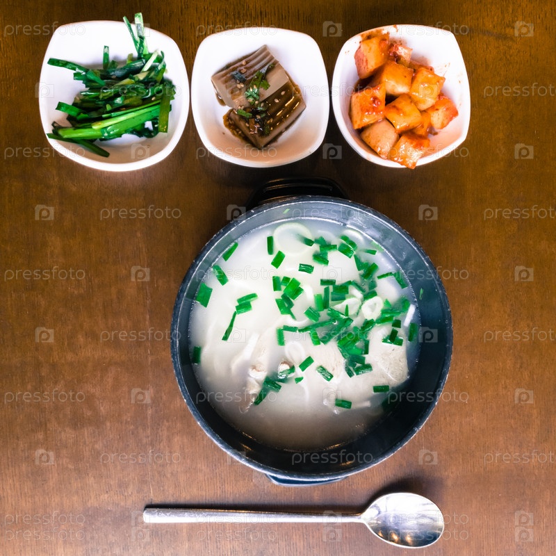 Seolleongtang (суп из бычьих костей), молочный суп из говядины и несколько гарниров. это местное блюдо Сеула, Южная Корея. вид сверху