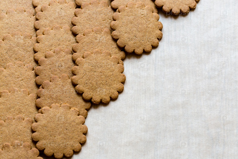 Вкусное имбирное печенье на бумаге для выпечки, традиционное рождественское угощение. Пряничный фон. Текстовое пространство, пустой шаблон