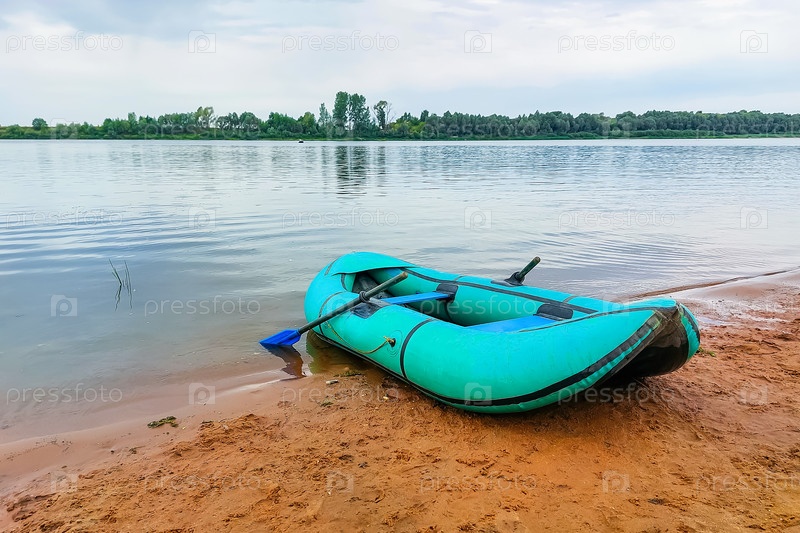 Надувная рыбацкая лодка с веслами на берегу реки